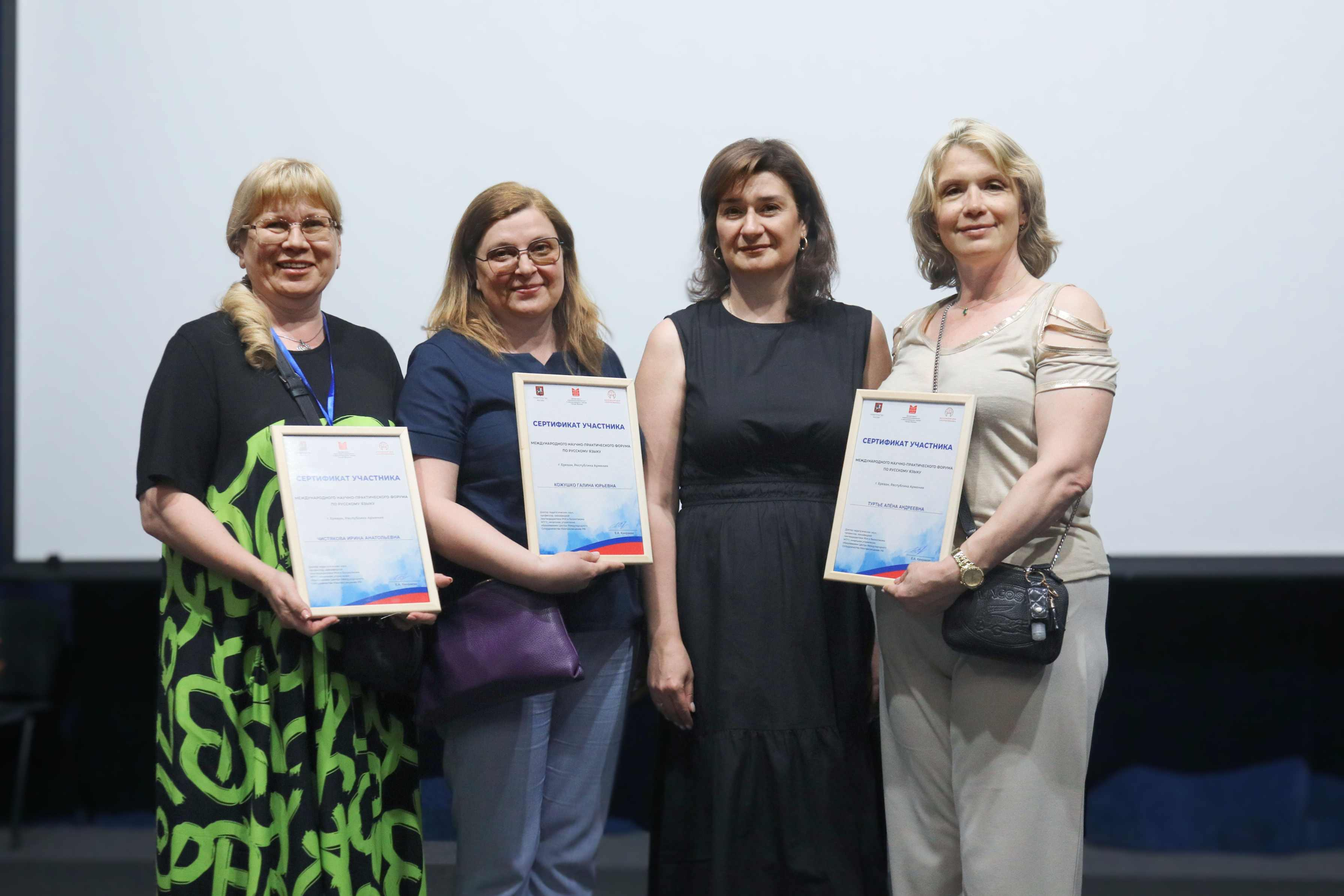 По окончании форума всем участникам были вручены сертификаты. Подводя итоги мероприятия, начальник Управления по работе с организациями соотечественников за рубежом Московского Дома соотечественника КаринэАсирбабаева отметила: «На протяжении последнего времени в Доме Москвы в Ереване прошли два важных мероприятия по поддержке и сохранению русского языка за рубежом, что является одним из важнейших направлений работы Правительства Москвы со своими зарубежными соотечественниками. От сегодняшнего форума у меня и, также, думаю, у всех его участников впечатления исключительно положительные и воодушевляющие. По-другому и не может быть, когда видишь благодарные глаза педагогов, которые приехали сюда. Кстати, мы благодарны Дому Москвы в Ереване за гостеприимный прием наших соотечественников, которые приехали из разных стран мира. Уверена, что эти два наших рабочих дня прошли весьма плодотворно и принесут ощутимые результаты для наших педагогов-русистов».