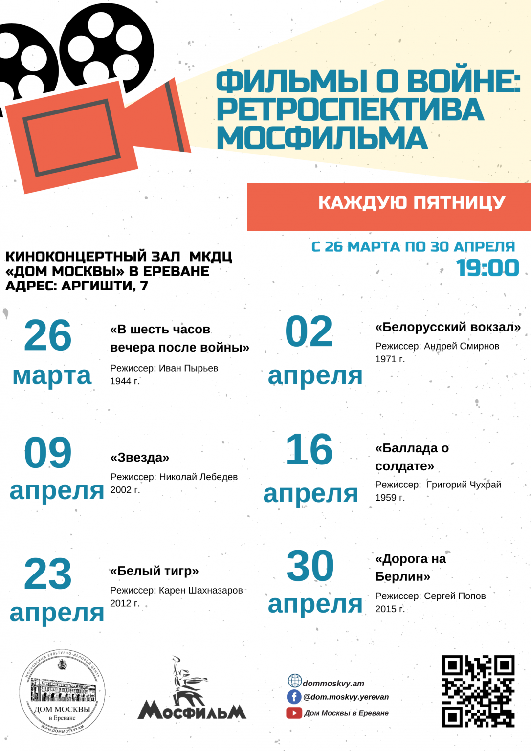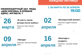 Каждую пятницу, с 26 марта по 30 апреля, в киноконцертном зале Московского культурно-делового центра «Дом Москвы» в Ереване будут проходить показы фильмов о Великой Отечественной войне из золотого фонда киностудии «Мосфильм».